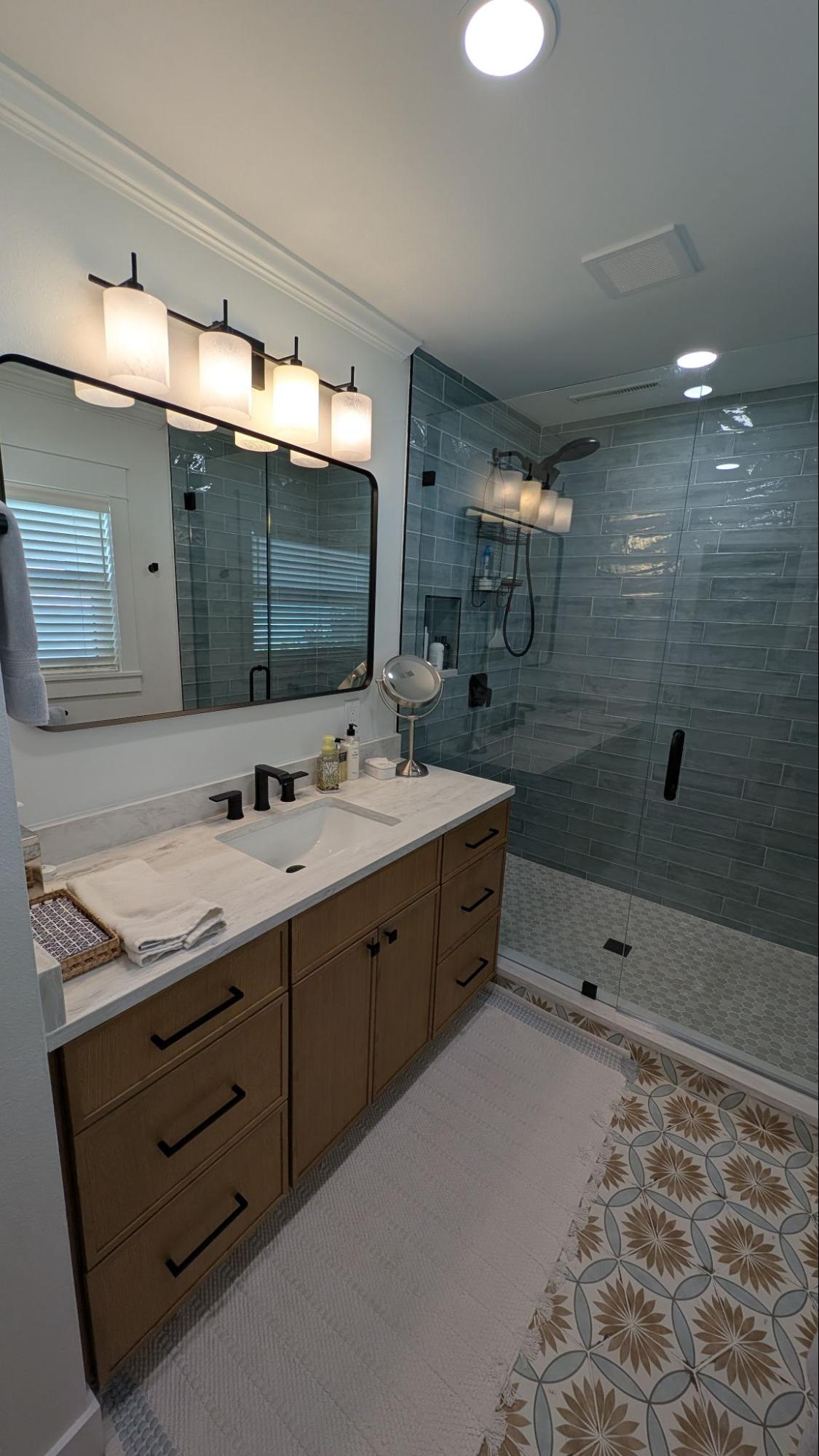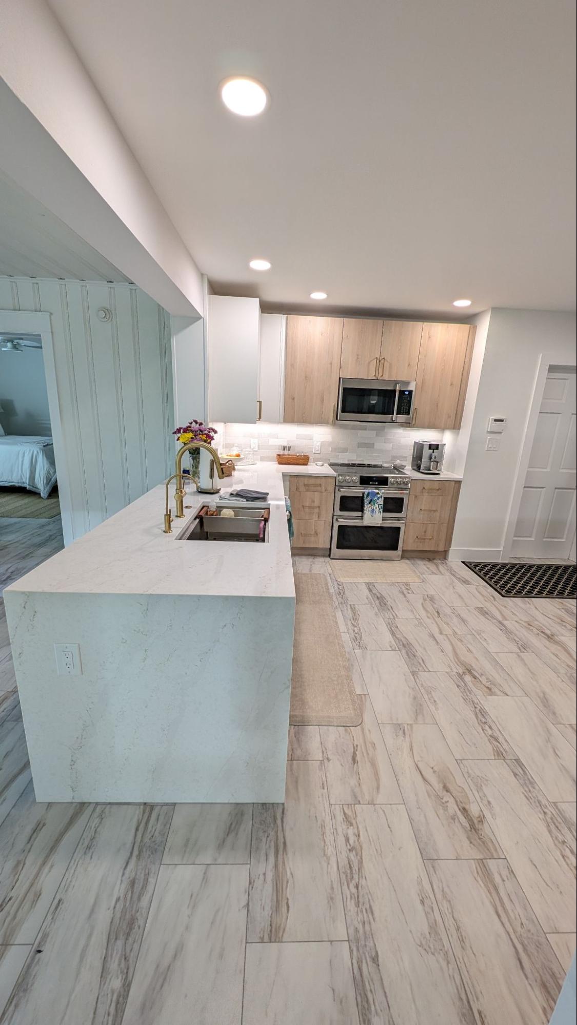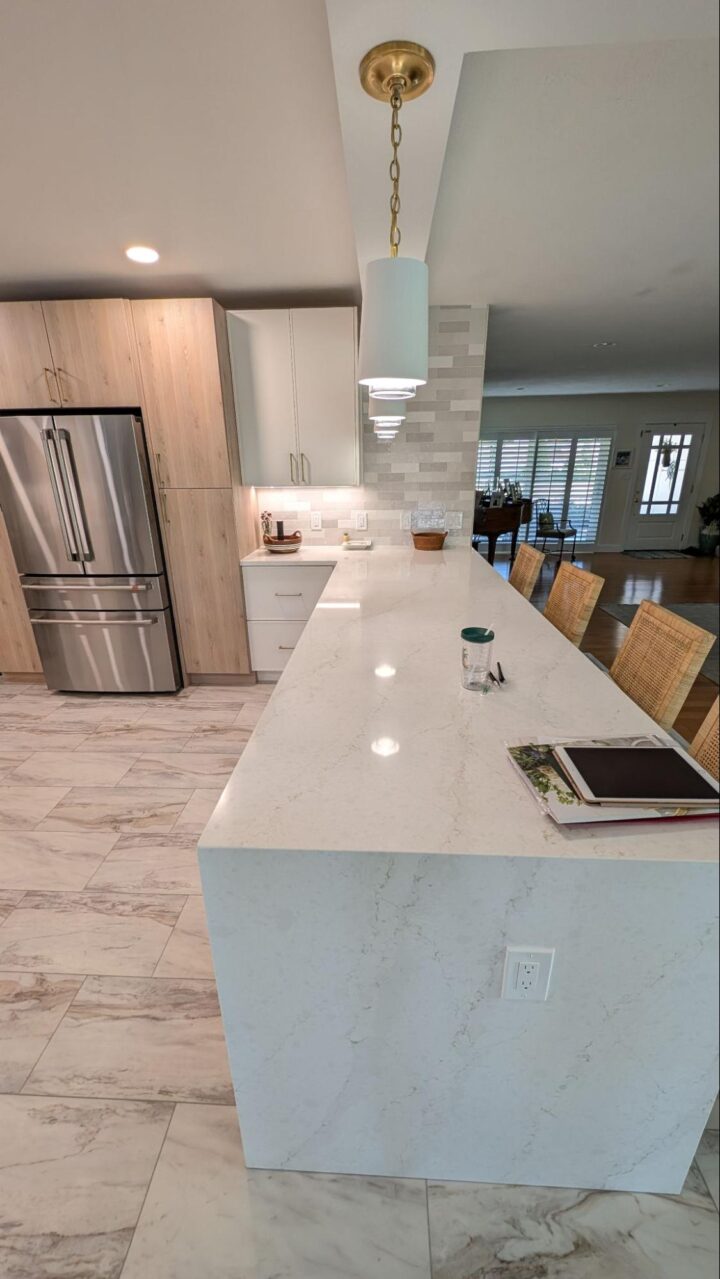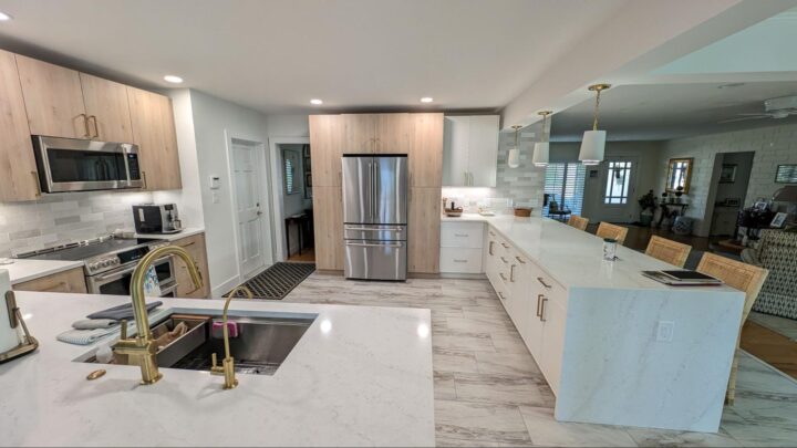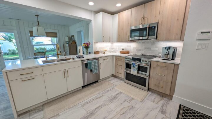 We were originally consulted prior to purchase of this home with the client looking to see if it were possible to open the floor plan at the rear of the home to improve the flow of the small dated kitchen that was cut off from the main living and entertaining space. The client wanted walls removed and needed to confirm it could be done and the approximate cost before committing to the purchase. This is where working with a Florida State Certified Licensed Contractor with over 24 years of expertise in construction and remodeling is critical. The client trusted our rough estimate and confidence we could make her vision a reality and purchased the home. We started our design process which included removing the rear concrete block structural walls at the rear of the home in order to do so. We designed a transitional kitchen using skinny white shaker cabinetry blended with European alternative textured wood grain doors to compliment the art deco period features of the home. Quartz CounterTops with Waterfall Ends